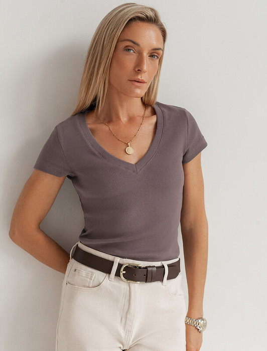 Стильная облегающая футболка кофейного цвета с V-образным вырезом сшита из плотного хлопкового трикотажа в рубчик с добавлением эластана, что гарантирует комфортную посадку по фигуре. V-вырез подчеркивает линию декольте, добавляя образу нотку элегантности. Практичная модель, которая не деформируется после стирок и сочетается с любым стилем одежды - от кэжуал до смарт-кэжуал.