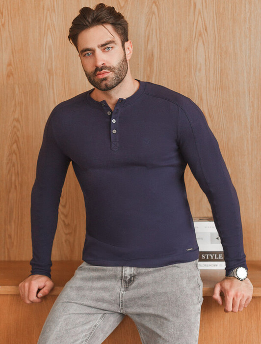 Лонгслив черного цвета выполнен из премиального хлопка с эластаном и идеально подходит для повседневной носки.  Круглый ворот с застежкой на металлические пуговицы с логотипом бренда добавляет образу стильный акцент, делая этот лонгслив универсальным выбором как для парней, так и для мужчин любого возраста.  Декоративные швы на рукавах и минималистичная вышивка в виде эмблемы VILATTE придают лонгу современный вид и подчеркивают его уникальность.