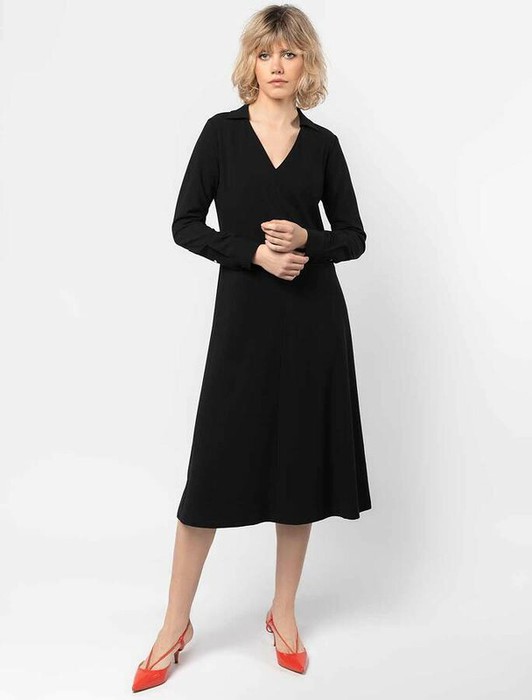 Платье приталенного силуэта и воротником-поло. Выполнено из эластичного крепа. Универсальная модель и трендовый крой в стиле 70-х годов, выгодная инвестиция для повседневного образа, деловой встречи или вечернего выхода. Можно носить с поясом, чтобы дополнительно подчеркнуть талию и А-силуэт.