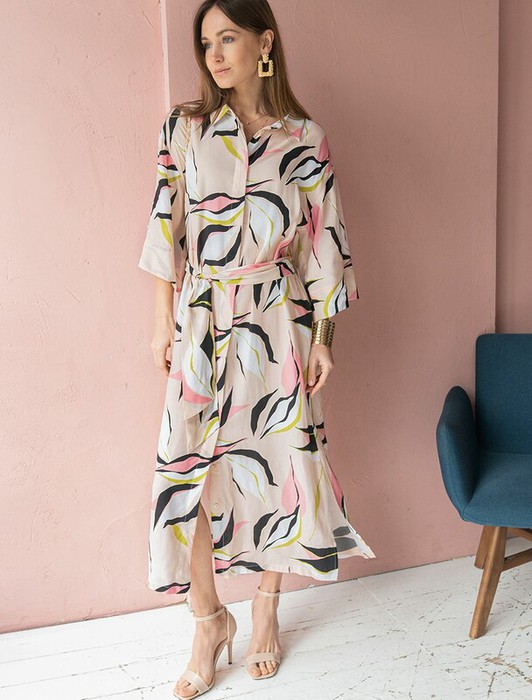 Платье-рубашка выполнено из вискозы. За счет добавления лиоцелла в состав изделия, ткань формоустойчива и надолго сохраняет безупречный внешний вид в течении долгого времени.  Модель дополнена разрезами по бокам и поясом-лентой.  Приятная на ощупь ткань охлаждает кожу в жаркую погоду, а крой не ограничивает свободу движений. Растительный принт подходит всем цветотипам.