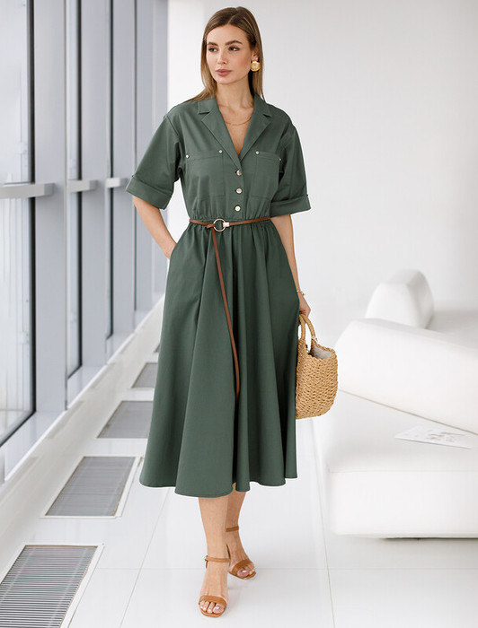 Совместные закупки Екатеринбург Женская одежда Платья — Vilatte Платье в стиле сафари с отложным воротником D22.253 темно-оливковый