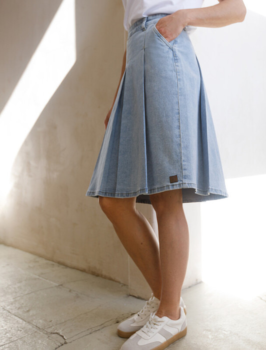 Юбка выполнена из эластичного денима. Расклешенная трендовая модель со средней посадкой и декоративной стиркой. Наличие эластана в составе изделия гарантирует комфорт и долговечность. Подходит для любой фигуры. Украшена фирменным патчем бренда.