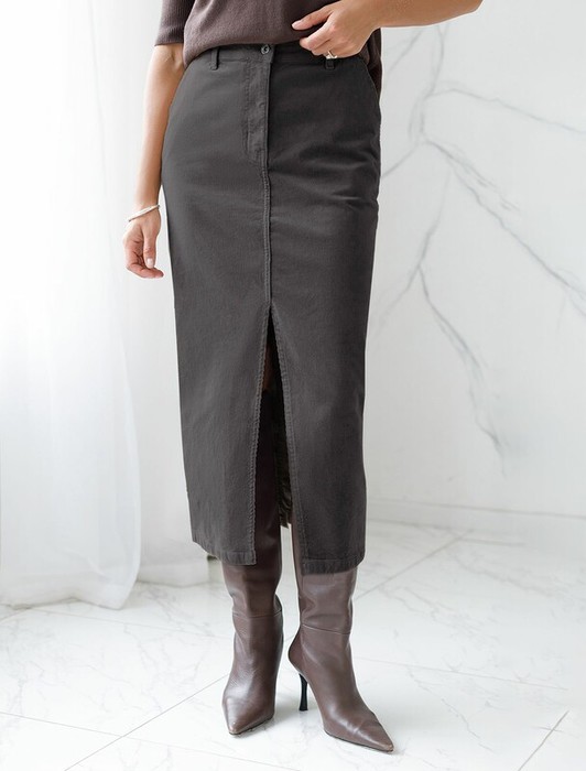 Юбка прямого кроя с выполнена из мягкого хлопкового микро-вельвета с добавлением эластана. Модель дополнена высоким разрезом спереди. Изделие комфортно садится по фигуре и не сковывает движения. Хорошо комбинируется с вязаным трикотажем, блузками и денимом. Также прекрасно станет альтернативой деловым низам в нестрогом офисном дресс-коде.