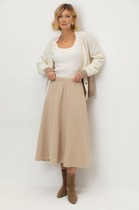 Юбка прямого силуэта выполнена узорной вязкой из мягкой хлопковой пряжи. Тонкий ажурный трикотаж идеально подходит для теплой весны и лета, в нем будет комфортно и не жарко. Модель дополнена разрезом на ноге и подкладкой из трикотажного полиэстера, такой материал гарантирует формоустойчивость юбки и скрывает излишнюю прозрачность. Сочетается в костюме с джемпером D33.007 и D39.629