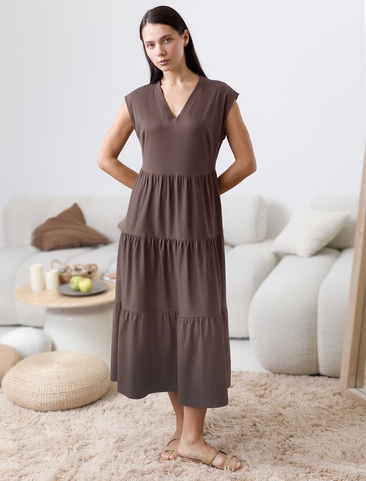Состав: 100%ХлопокСтильное платье миди с V вырезом практичного кофейного цвета выполнено из 100% хлопка плотностью 140 Г/м2. Главная особенность этого изделия — тонкое кулирное полотно, которое легче и воздушнее стандартного трикотажа. Благодаря своей деликатной текстуре модель идеально подходит для домашних образов и пижамных комплектов. Ткань отлично «дышит», обеспечивая максимальный уют во время сна и отдыха. Платье ярусного кроя красиво подчеркивают фигуру, скрывая возможные недостатки и акцентируя достоинства. Свободное платье отлично подойдет на большие размеры. Длина платья миди обеспечивает гармоничное сочетание комфорта и элегантности, подходя для разных поводов. V-образное декольте придает образу нежность и женственность, а ярусная конструкция добавляет образу эффект воздушности и динамичность. Материал натуральный и приятный к телу, создает ощущение легкости и свежести. Такое повседневное платье подчеркнет индивидуальность и стиль.