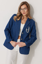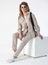 Жакет прямого силуэта, выполнен из однотонной ткани, жакет на подкладке. Полочка жакета с центральной застежкой на петлю пуговицу. Полочка с вертикальными рельефами и прорезными карманами с клапанами. Горловина V-образной формы с отложными лацканами и воротником пиджачного типа. Спинка со средним швом и вертикальными рельефами. Рукав втачной, двухшовный. Жакет на плечиках.