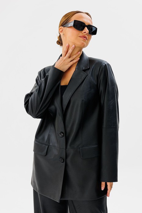 Этот жакет из эко-кожи — идеальная основа для формирования безупречного образа. Его строгий прямой силуэт несет в себе отсылку к классической элегантности, придавая фигуре собранный и уверенный вид. Пиджачный воротник с выразительными лацканами подчеркивает четкость линий и добавляет образу структурности.
