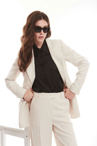 Укороченный жакет прямого кроя, выполнен из теплой ворсистой ткани, цвета Хаки. Характеристики: прямой крой, подкладка, застежка центральная на петли пуговицы, рукав свободного кроя спущен. Длина по спинке 68 см, длина рукава от края горловины 70см.