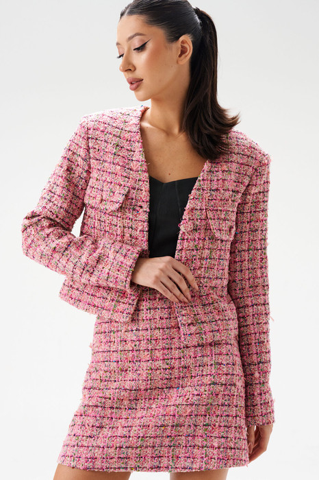 Жакет полуприлегающего силуэта выполнен из яркого текстурного полотна розового цвета, с декоративными элементами. Характеристики: V образный вырез горловины, застежка центральная на петли пуговицы (декорированы тканью основного изделия), талиевые вытачки по спинке жакета, по переду два накладных кармана с клапанами, рукав прямого кроя. Длина по спинке 48 см, длина рукава 63 см.