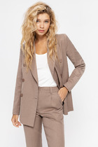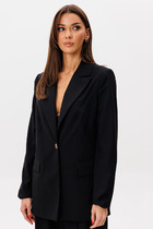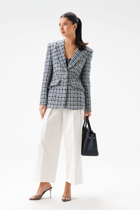 Жакет приталенного силуэта выполнен из фактурной твидовой ткани с геометрическим узором. Характеристики: полуприлегающий силуэт, подплечники, подкладка, воротник с остроугольным лацканом, застежка центральная на петлю пуговицу, по передней части функциональные карманы с клапаном, рукав втачной, по низу рукава нашиты пуговички. Длина по спинке 69 см, длина рукава 64 см