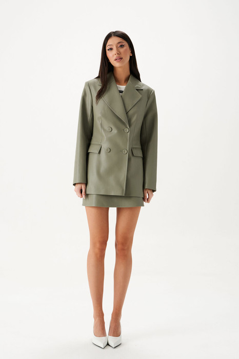 Жакет двубортный. Выполнен из эко-кожи оливкового цвета. Полуприлегающий силуэт, подклад, приталиевые выточки по передней части, в среднем шве спинки разрез 19 см. Воротник с остроугольным лацканом. Застёжка петли-пуговицы (декорированы тканью основного изделия). Карманы по переду внизу с клапаном без застёжки (функциональные). Рукав втачной, на рукаве петли-пуговицы (нефункциональные, декорированы тканью основного изделия. Длинаи жакета по спинке 70 см, длина рукава 61см.