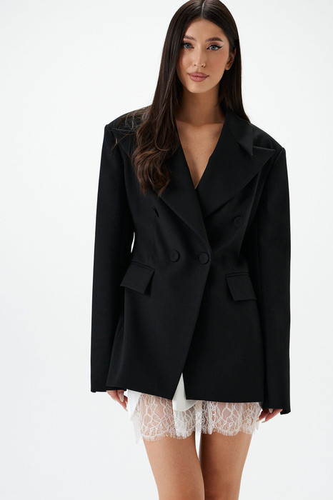 Жакет приталенного силуэта. Выполнен из текстильной ткани. С подкладкой. Воротник пиджачного типа с лацканами. На переде по линии талии карманы в рамку с клапаном. Рукав втачной. Локтевой шов заканчивается шлицей, с имитацией застегивания на петли и пуговицы. Застежка центральная на петли и пришивные пуговицы