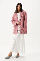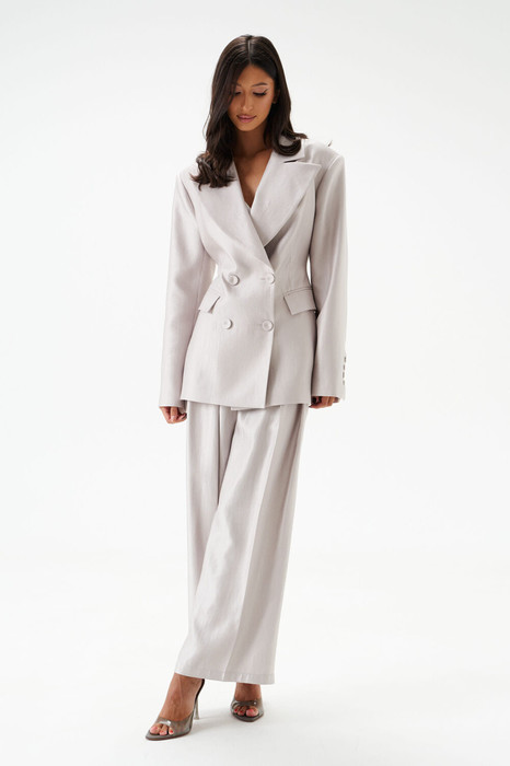 Жакет двубортный. Выполнен из полотна серо-перламутрового цвета с блеском. Полуприлегающий силуэт, подклад, отрезной бочок, приталиевые выточки по передней части. Воротник с остроугольным лацканом. Застёжка петли-пуговицы (декорированы тканью основного изделия). Карманы по переду внизу с клапаном без застёжки (функциональные). Рукав втачной, на рукаве петли-пуговицы (нефункциональные, декорированы тканью основного изделия), длина рукава от края горловины 80 см. Длина спинки жакета 72 см.