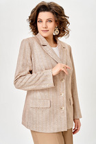 Жакет прилегающего силуэта выполнен из костюмный ткани бежевого цвета. Характеристики: прилегающий силуэт, однобортный, подплечники, вортник стойка переходяший в V-образный вырез, брендированная подкладка, застежка центральная на 3 пуговицы, рукав втачной, по низу рукава 3 пуговицы, декоративный волан, вставленный по талии. Длина по спинке от края горловины 75 см, длина рукава 64 см.