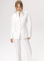 Жакет прямого свободного кроя выполнен из костюмной ткани черного цвета. Характеристики: прямой свободный крой, брендированная подкладка, подплечники, воротник с остроугольным лацканом, застежка центральная на петлю - пуговицу, по переду функциональные карманы с клапаном, рукав к низу расклешен, втачной, чуть спущен, по низу рукава нашиты пуговички, спинка цельнокроеная. Длина по спинке 77, длина рукава от края горловины 84 см.