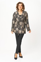 Жакет 2-бортный, на подкладке. Рукав короткий, втачной, одношовный, по окату собран складками дляя увеления объёма. Обработаны талиевые вытачки по переду и спинке изделия