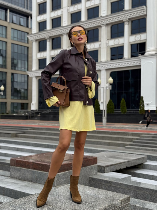 Жакет однобортный, на подкладке, выполнен из эко-кожи. Обработан молнией разъёмной молнией по центру переда, закрывающейся планкой с пуговицами. Воротник тложнй, рубашечного типа. Рукава втачные одношвные, прямые. По передним половинкам обрабтаны накладные карманы с клапаном.