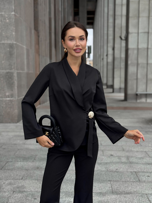 Жакет без подкладки, швы обработаны кантом в цвет изделия. Рукав втачной, прямой, одношовный. Воротник шаль. Застежка на притчной пояс, дополнен съёмной пряжкой золотистого цвета