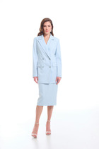 Двубортный жакет на подкладке, прямого силуэта. Выолнен из замшевой ткани. Обработаны прорезные карманы по переду. Рукава втачные одноосновные, обработаны шлицей.