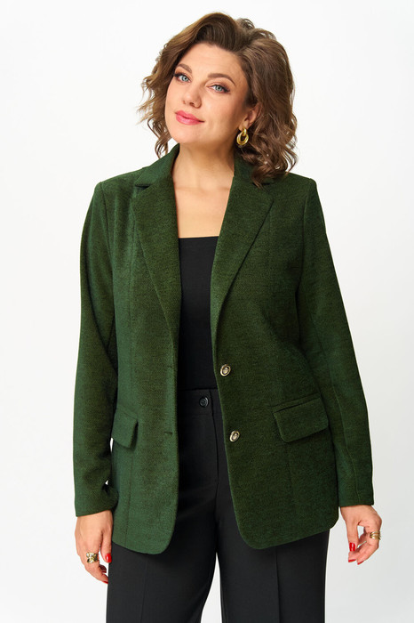 Жакет женский удлиненный, из трикотажной ткани, перед жакета на подкладке, полуприлегающего силуэта с центральной бортовой застежкой на пуговицы до линии перегиба лацкана. Спереди рельефные швы от плечевого шва, отрезной бочок и карман с клапаном. Спинка с рельефами от плечевого шва. Рукав втачной, двухшовный. Воротник пиджачного типа. Длина по спинке 70, длина рукава 61.