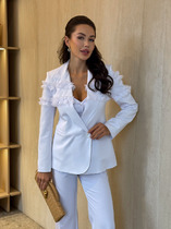 Жакет женский удлиненный, полуприлегающего силуэта с центральной бортовой застежкой на пуговицы до линии перегиба лацкана. Спереди рельефные швы от плечевого шва, отрезной бочок и карман с клапаном. Спинка с рельефами от плечевого шва. Рукав втачной, двухшовный, 3/4, с небольшим разрезом в локтевом шве. Воротник пиджачного типа. Перед жакета на подкладке. Длина рукава 50, длина по спинке 68 см.