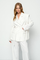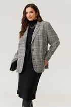 Жакет удлиненный, из текстильной ткани, полуприлегающего силуэта с центральной бортовой застежкой на пуговицы до линии перегиба лацкана. Спереди рельефные швы от плечевого шва, отрезной бочок и карман с клапаном. Спинка с рельефами от плечевого шва. Рукав втачной, двухшовный. Воротник пиджачного типа. Жакет на подкладке, длина по спинке 67 см, длина рукава 62 см