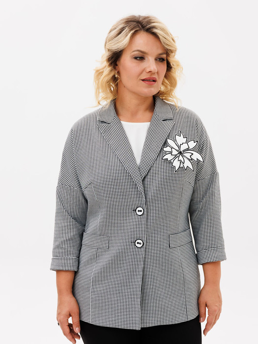 Жакет из поливискозной ткани, в мелкую гусиную лапку .Жакет свободного силуэта, длиной ниже линии бедер, со спушенной линией плеча. Детали переда с отрезными боковыми деталями, воротником жакетного-типа. На боковых частях переда расположены боковые карманы. В комплект входит пояс из основной ткани, подчеркивая силуэт, делает его более приталенным . Спинка с боковыми отрезными деталями. Рукава длинной 7/8. Классические . Жакет на подкладке. В комплект входит дизайнерский-декоративный цветок, при желании его можно снять. Классика изначально обречена на успех.
