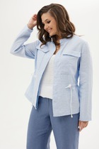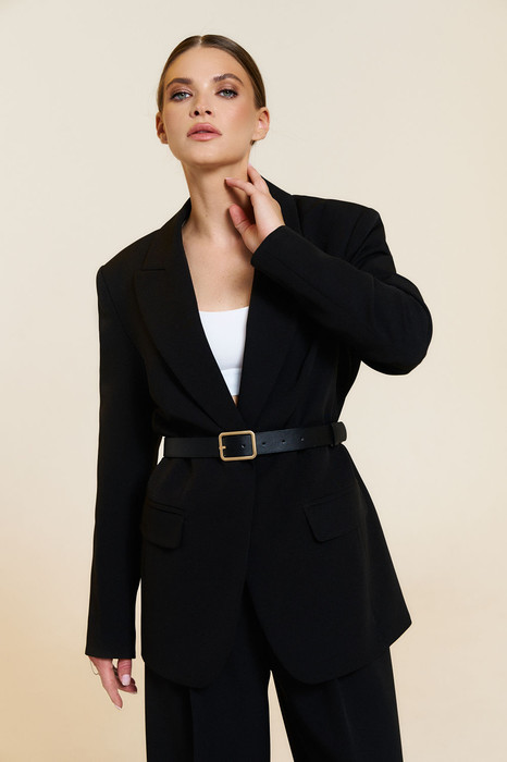Жакет женский из ткани платьево-костюмного ассортимента черного цвета на подкладке. Перед с разрезной выточкой, входящей в прорезной карман в рамку с клапаном. Спинка прямая. Бочок переда и спинки цельнокроенный. Рукав двухшовный втачной. Воротник пиджачного типа вставлен на раскепы. Борта обработаны подбортами округлой формы. Застежка на пришивные кнопки,  талию фиксирует съемный пояс.