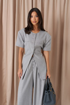 Застёгивается на одну петлю и пуговицу, что подчёркивает лаконичность и утончённость модели. На переде расположены карманы «в рамку» с клапанами — стильная деталь, добавляющая образу строгости и завершённости.
