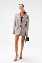Жакет выполнине из плотной искуственной замши. Жакет Х-обраного силуэта, длиной ниже линии бедер. Спереди рельефы от проймы до низа, прорезные карманы с клапанами и центральная бортовая застежка на пуговицы. Воротник пиджачного типа. На спинке средний шов. Плечевой шов удлинен. Рукав втачной, двухшовный, по низу заднего шва шлица с застежкой на пуговицы. Жакет на притачной по низу подкладке.