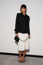 Жакет с центральной застежкой на петли и пуговицы, с втачным воротником с отрезной стойкой, с V-образным вырезом горловины. По переду с рельефами, выходящими из плеча до низа. Низ жакета фигурный. По рельефам переда- разрезы. Спинка со средним швом, рельефами, выходящими из плеча до низа.