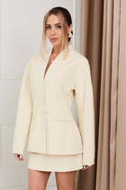 Жакет с центральной застежкой на петли и пуговицы, с цельнокроенной стойкой. По переду с рельефами, выходящими из проймы до низа. На уровне линии бедер расположены прорезные карманы в рамку. Спинка со средним швом, рельефами, выходящими из проймы до низа. Рукав цельнокроенный, длинный.