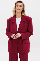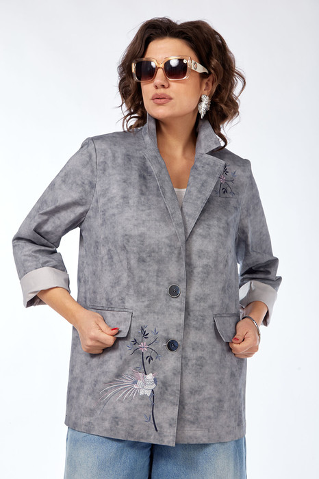 Блейзер женский, прямого силуэта, выполнен из хлопковой ткани костюмного ассортимента. Воротник пиджачного типа, застежка центрально-бортовая на две петли и пуговицы. По переду обработана нагрудная листочка и прорезные карманы с клапаном и двумя обтачками, фигурные рельефы выходящие из проймы. Спинка со средним швом, в котором имеется высокая шлица. Рукава втачные двухшовные, с широкой подборкой низа. Изделие декорировано дизайнерской вышивкой.