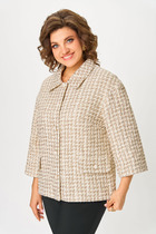 Жакет женский однобортный на подкладке прямого силуэта из трикотажной ткани. На передних частях жакета отрезной бочок с нагрудными вытачками.  Обработаны прорезные карманы «в рамку» с клапаном. На левой части переда обработан карман с листочкой и декоративной пришивной деталью.  Листочка, рамки кармана и нижний воротник выполнены из искусственной кожи. Спинка со шлицей в среднем шве. Рукав втачной двухшовный. Горловина обработана втачным воротником с отложными лацканами. Низ передних частей имеет закругленную форму.  Жакет застегивается н а 2 декоративный пуговицы.