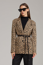 Жакет однобортный умеренного объёма приталенного силуэта с застёжкой на пуговицу. По бокам расположены функциональные прорезные карманы с клапаном. Окантовка воротника и клапанов карманов выполнена из контрастной ткани с леопардовый принтом. Рост фотомодели 175 см. Размер у фотомодели – 44.