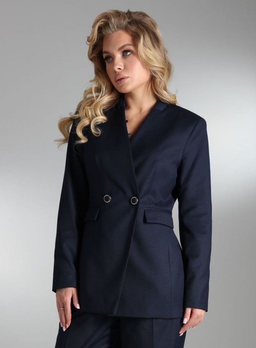 Двубортный жакет полуприлегающего силуэта с застёжкой на две пуговицы с прорезными карманами с листочками и клапанами. Нагрудные вытачки на полочках расположены вертикально и совмещены с талиевыми, заканчиваются входом в карман. Спинка имеет плечевые вытачки, средний шов со шлицей. Рукава двухшовные, длинные. Воротник – стойка переходит в край борта, имеющий V-образную форму. Застежка на прорезные петли и пуговицы. Жакет полностью обработан притачной подкладкой.