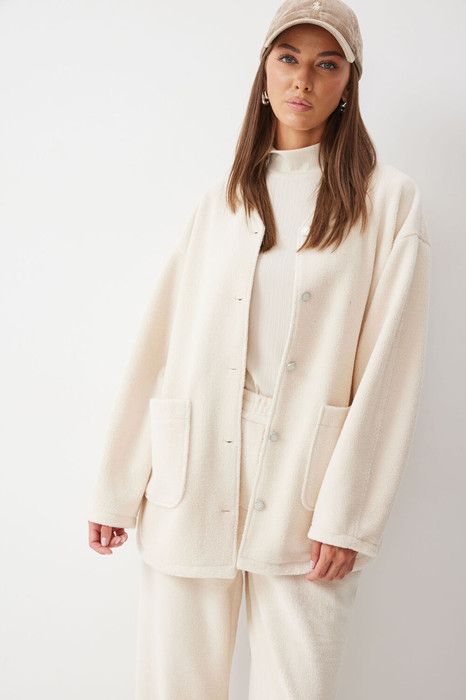 Жакет прямого силуэта с фигурным низом из трикотажного полотна. Горловина округлая, по центру застежка на кнопки. Рукав со спущенной линией плеча. По переду накладные карманы. Жакет без подкладки. Обращаем ваше внимание, что фурнитура может отличаться от фото.