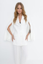 Жакет прямого силуэта, воротник пиджачного типа, рукав одношовный, втачной с незначительно спущенной линией плеча, длиной три четверти, с патой. По линии ткани настрачная кулиса с завязками из основной ткани. Застежка центрально-бортовая. Линия низа верхней части фигурная ассиметричная.