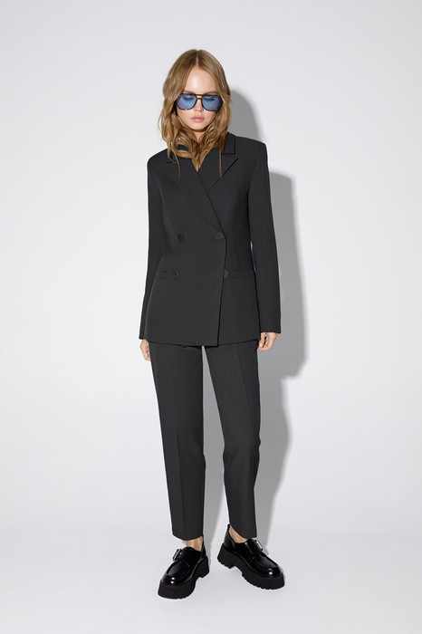 Текстильный классический жакет прямого кроя. Детали: жакет полуприлегающего силуэта, пиджачный воротник, перед с прорезными карманами, двубортная застежка на петли и пуговицы, спинка со средним швом, рукава втачные двухшовные, жакет на подкладке