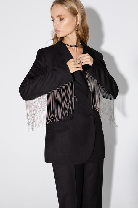 Текстильный жакет с металлической бахромой по спинке. Детали: жакет прямого силуэта, пиджачный воротник, прорезные карманы с клапанами, спинка со средним швом, втачные двухшовные рукава, жакет на подкладке