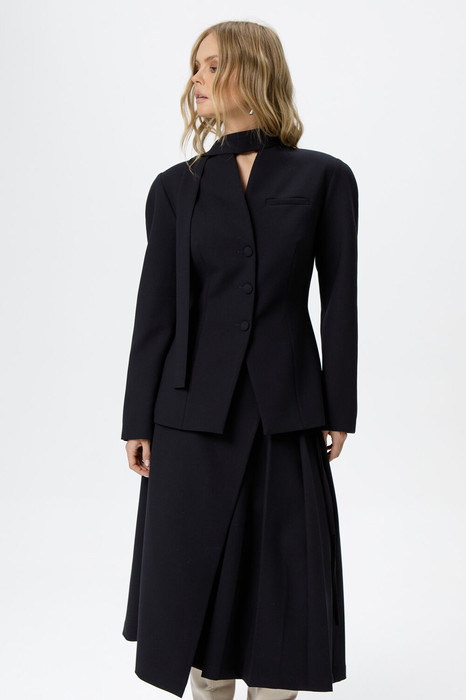 Приталенный жакет с акцентными плечами и воротником-стойкой.