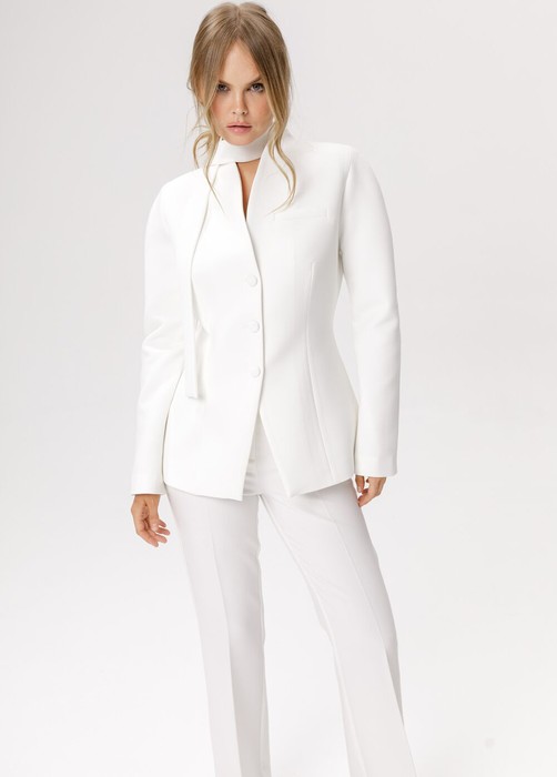 Приталенный жакет с акцентными плечами и воротником-стойкой.