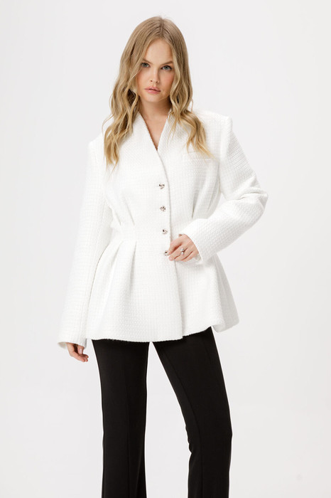 Приталенный жакет со складками и расширенными плечами из фактурной ткани.