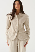 Модель прямого силуэта, на подкладе. Спереди накладные карманы с клапанами и застёжкой на пуговицу. В верхней части декоративные клапаны с пуговицей. Спинка со средним швом. Жакет декорирован бахромой.