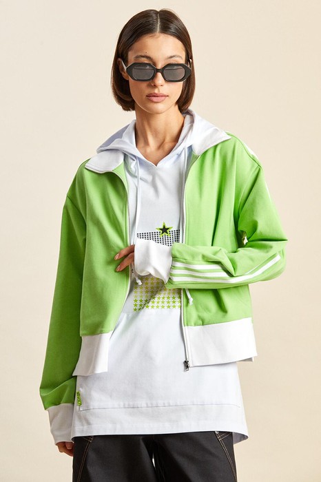 - вдоль рукавов, линии плеча и через воротник проходят широкие лампасы с печатными полосками.