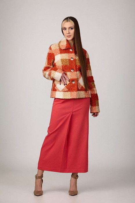 Жакет на подкладке из пальтовой ткани «под каракуль». Силуэт прямой, по переду нагрудные вытачки и накладные карманы с клапанами округлой формы. Пройма спущена, рукава узкие. Воротник с закругленными углами с притачной стойкой. Застегивается на 4 пуговицы.