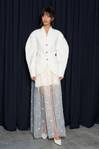 По низу рукавов, борту жакета, низу и стойке идет отделка бахромой. Средняя длина жакета - 60,5 см (±3,0 см), средняя длина рукава - 61,0 см (±3,0 см).