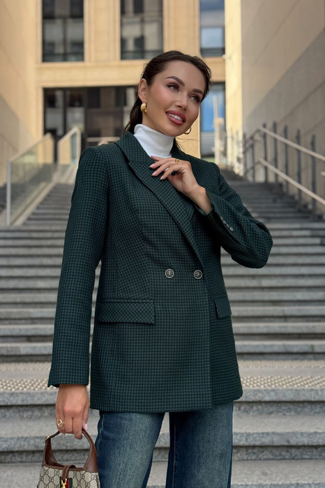 Жакет URS в принт «гусиная лапка» — это элегантный выбор для женщин, которые ценят классику и современный стиль. Легендарный узор в сочетании с тёмно-зелёным оттенком делает модель универсальной: она идеально подходит как для офиса, так и для повседневных образов. Жакет женский, полуприлегающего силуэта, выполнен из костюмной ткани, на подкладке, с двубортной застежкой на 2 петли и пуговицы (размер и цвет фурнитуры может незначительно отличаться от фото), для повседневной носки.Перед и спинка с отрезным бочком. Перед в нижних частях с прорезными карманами с клапаном и обтачками, с талиевыми вытачками, идущими от карманов вверх. Верхняя левая часть переда с функциональным карманом с листочкой.