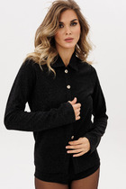 Жакет укороченный из костюмной ткани. Застёжка по переду на кнопки. По переду накладные карманы с клапаном. Воротник отложной. Рукав прямой на трикотажной манжете. Низ жакета на трикотажном поясе. Жакет на подкладке.
