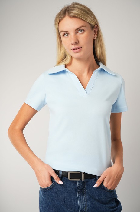 Голубая футболка поло из трикотажа кулирная гладь выполнена в лаконичном дизайне: прямой крой, отложной воротник и V-вырез добавляют изящности. Хлопковое поло подойдет для похода в офис, на прогулку и для дома.